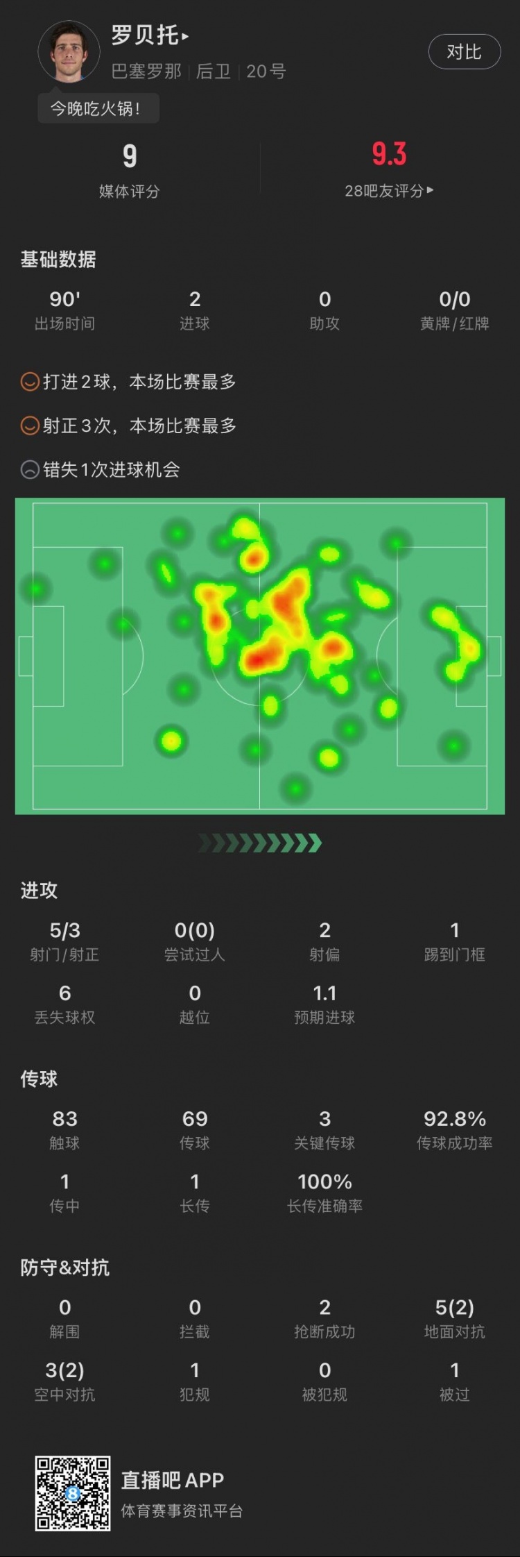 队长挺身而出!罗贝托本场数据:双响救主,获评9分全场第二高