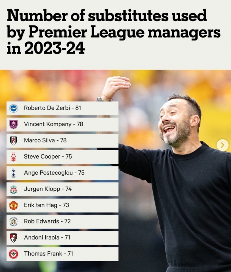 英超换人次数排行榜:德泽尔比81次第一,瓜帅、戴奇仅48次垫底