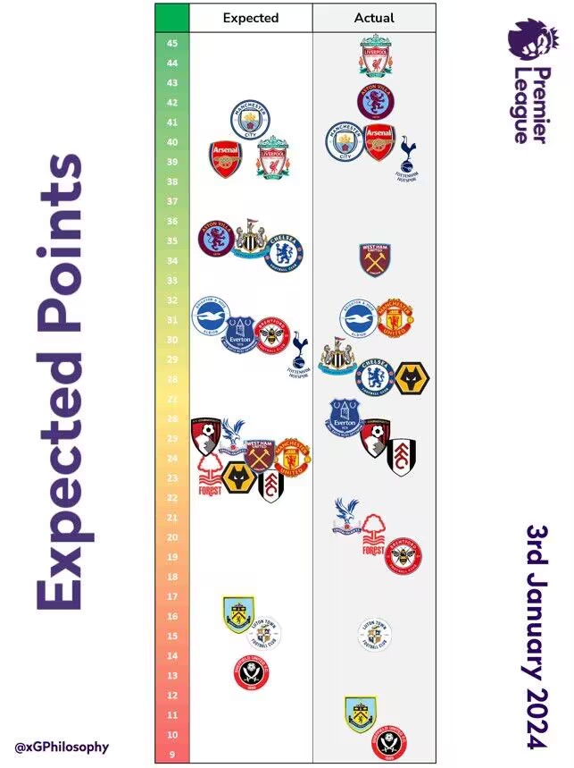 英超预期积分与实际积分对比:利物浦、维拉、热刺、曼联超预期