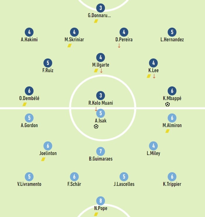 后防干看着纽卡远射被扑伊萨克补射得手,巴黎01落后