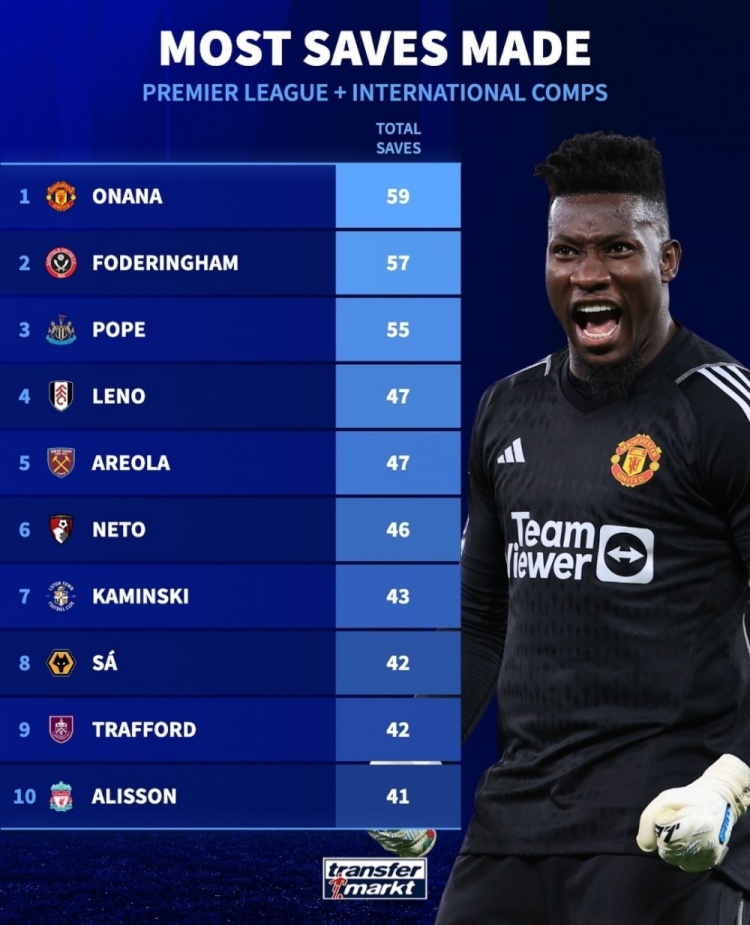 本赛季英超门将扑救次数榜:奥纳纳59次居首,波普第三