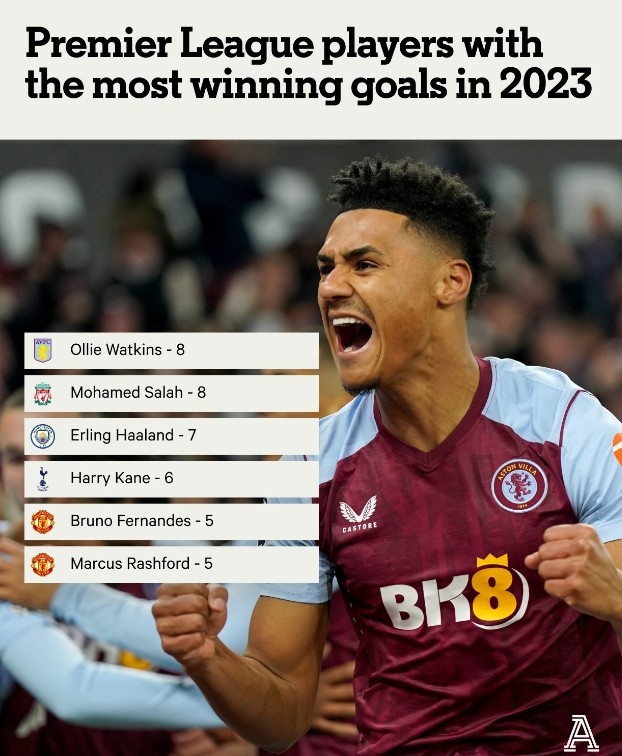 2023年英超打进致胜球榜:萨拉赫&沃特金斯8球第1,哈兰德7球