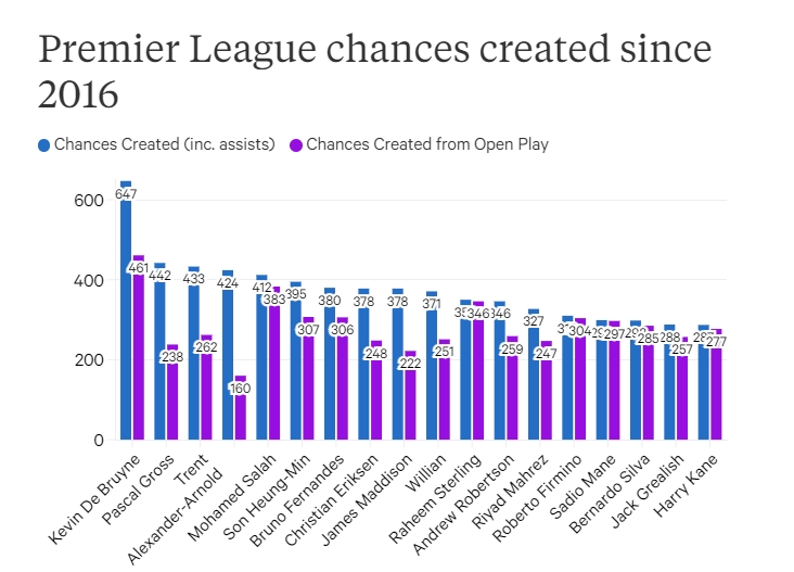 16年至今英超球员创造机会:德布劳内647次居首格罗斯442次第二