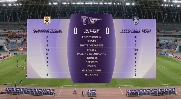 泰山vs柔佛半场数据:泰山队控球率仅35%,射正次数03落后