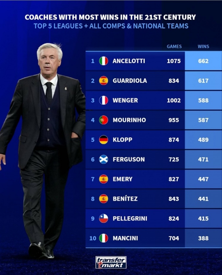 21世纪各项赛事主帅胜场次榜:安切洛蒂662胜居首,瓜帅次席