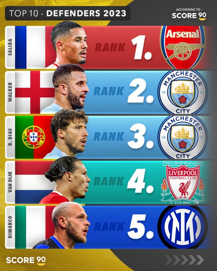 score90评选2023年度后卫Top10:萨利巴、沃克前二,金玟哉第6