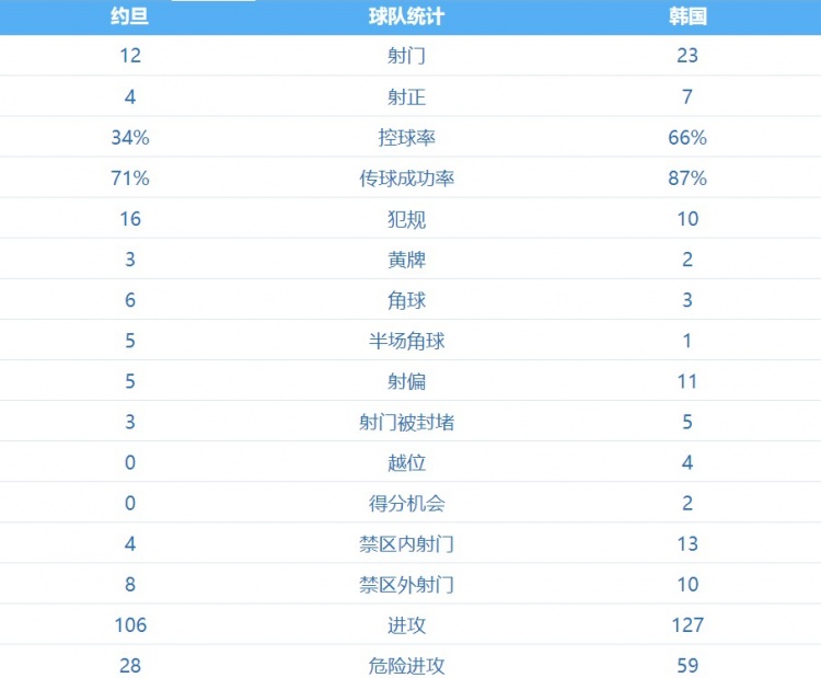 韩国vs约旦全场数据:韩国队控球率66%,射门次数23比12占优