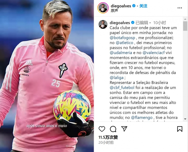 39岁的前巴西国门迭戈阿尔维斯,通过社媒宣布退役