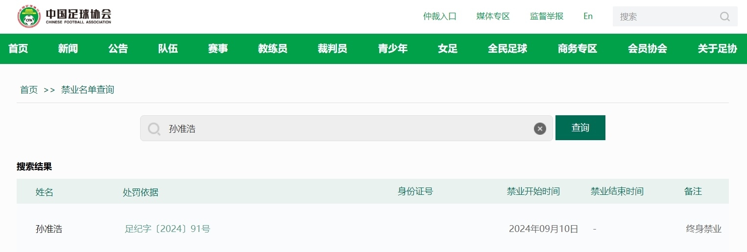 足协官网上线"禁业名单查询",可查询禁业球员姓名身份证号等信息