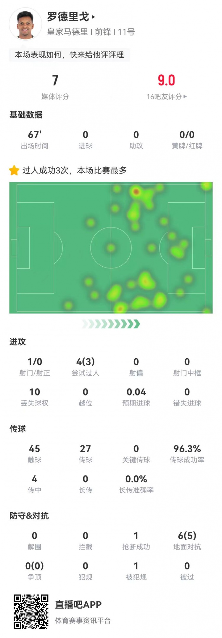 罗德里戈本场1射0正+0关键传球3成功过人、5成功对抗获评7.0分
