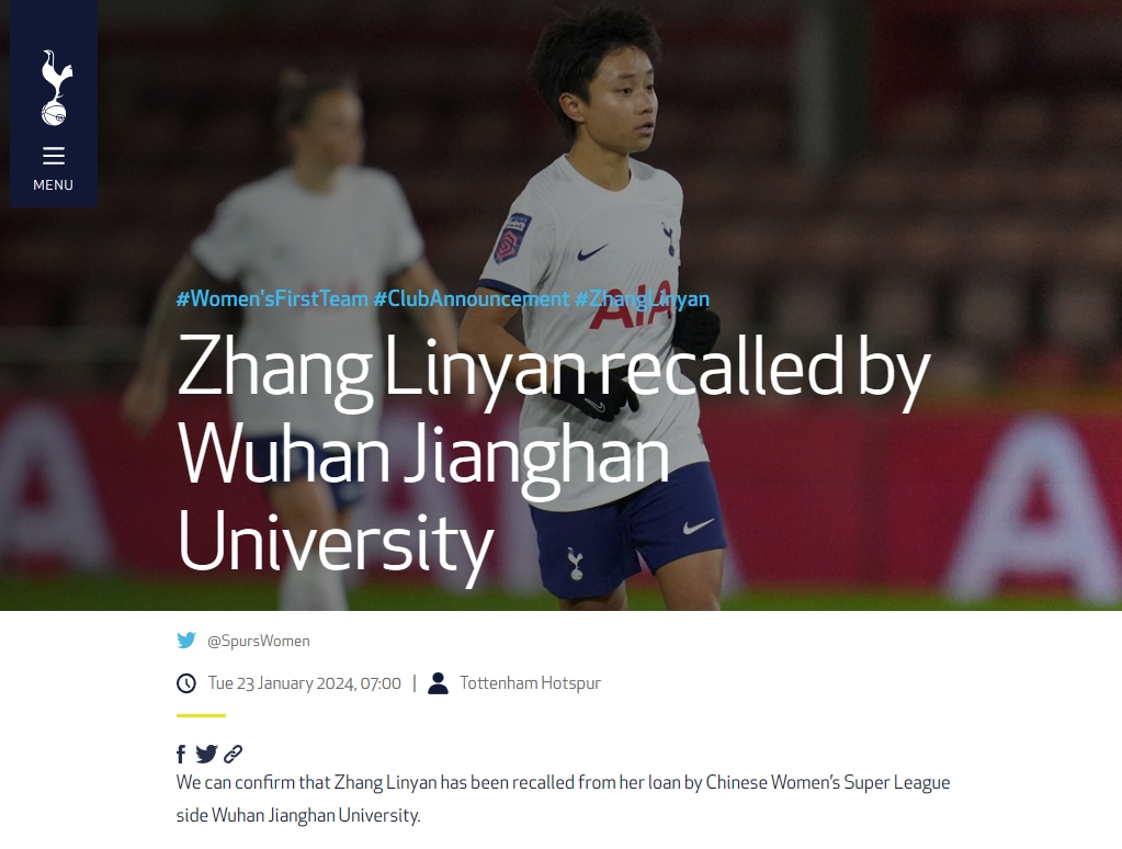 仅四个月官方:张琳艳结束热刺留洋生涯!遭武汉女足召回