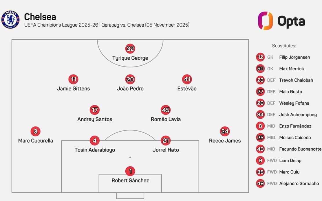 23岁97天,切尔西排出英格兰球队欧冠客场第二年轻的首发