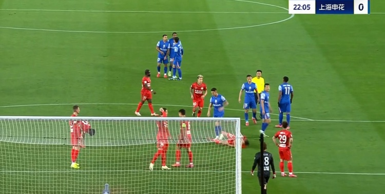 第23分钟,申花左侧角球机会,禁区内卡位时路易斯故意推搡黄锐烽,后者倒地,主裁黄牌警告路易斯↓